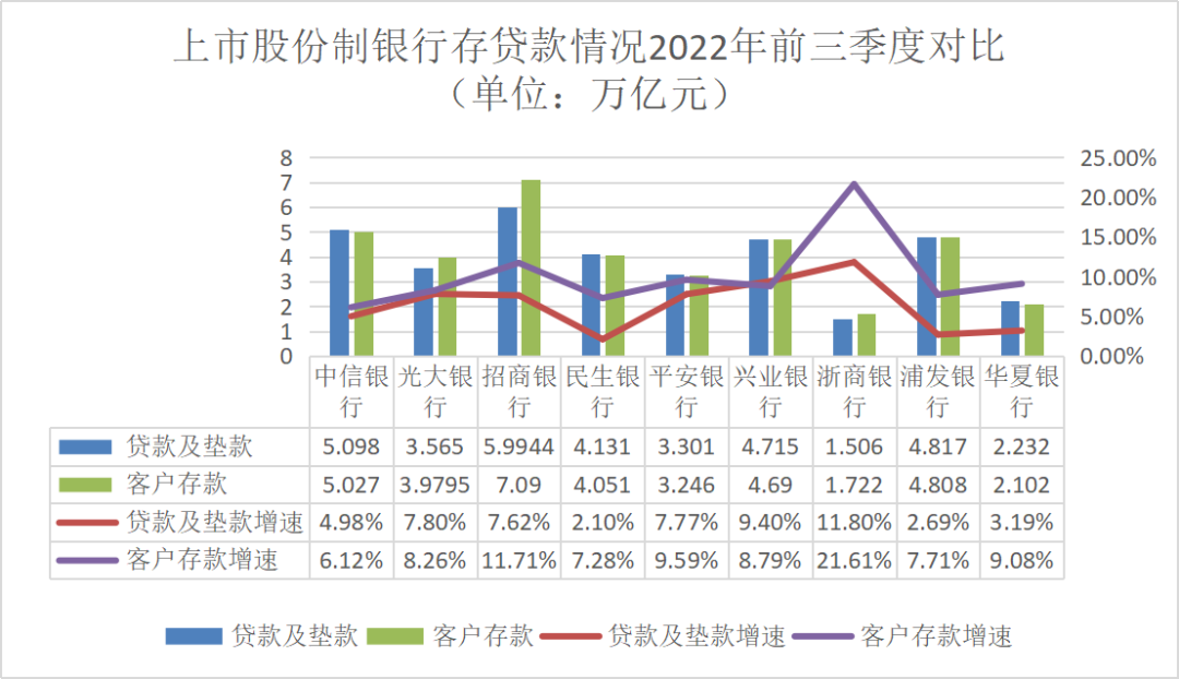 负债端方面,客户存款仍是股份制商业银行负债的主要来源。截至2022年9月,九家上市银行的客户存款余额合计36.72万亿元,同比增长7.11%。浙商银行因体量最小,增长空间较大,增速最快,达21.61%。 招商银行无愧于“零售之王”的称号,综合表现最为出色,是唯一一家客户存款金额突破7万亿元大关的股份制银行,而且增速达到11.71%,仅次于浙商银行,保持着高位优势。