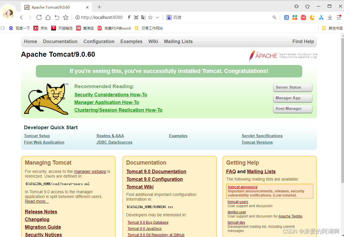 浏览器输入以上地址,按回车(80是默认端口,如果手动改过端口,则输入改动后的端口),页面正常打开,则表示已经安装好了tomcat。