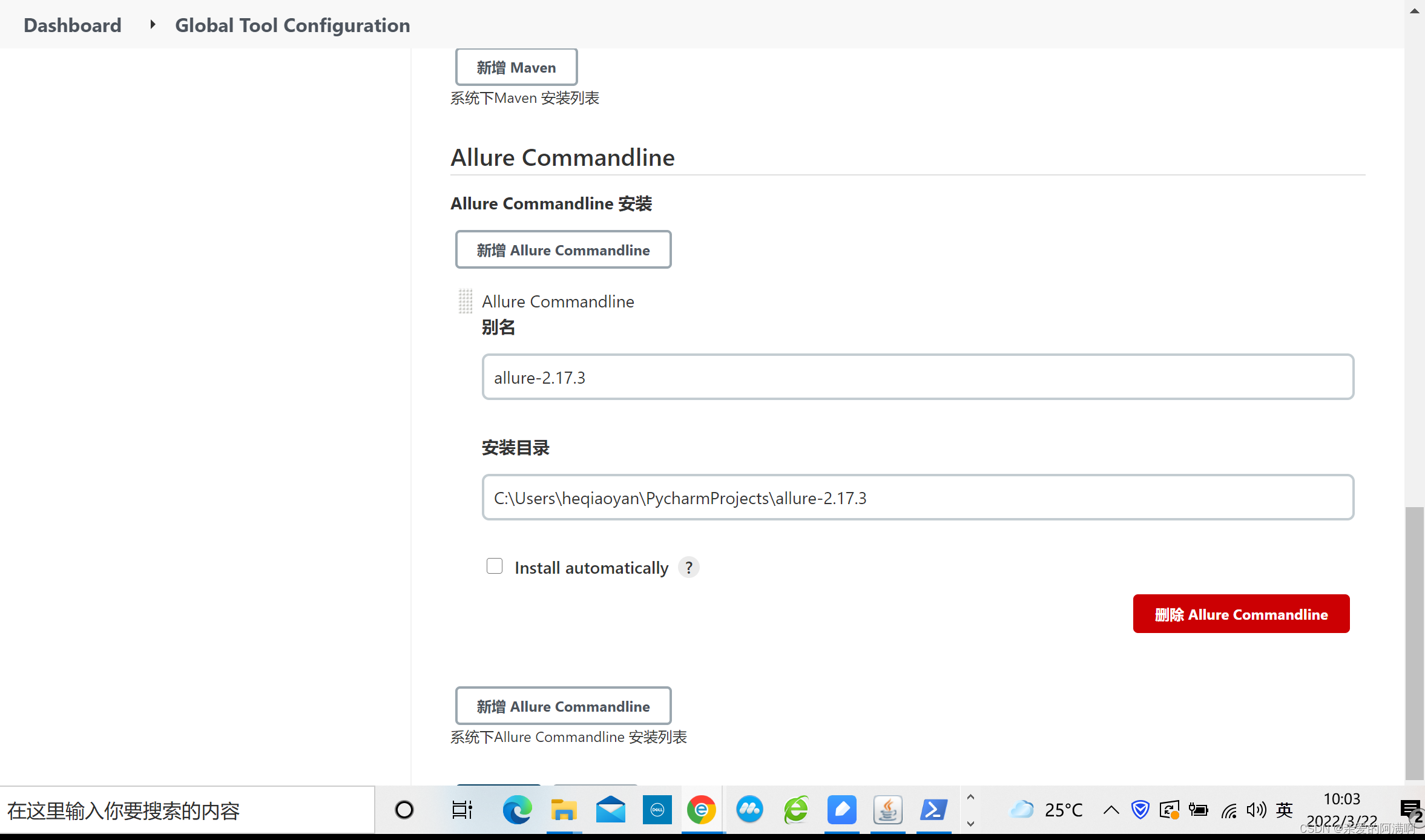 如果jenkins是在本地跑,安装目录可选择本地的Allure安装目录