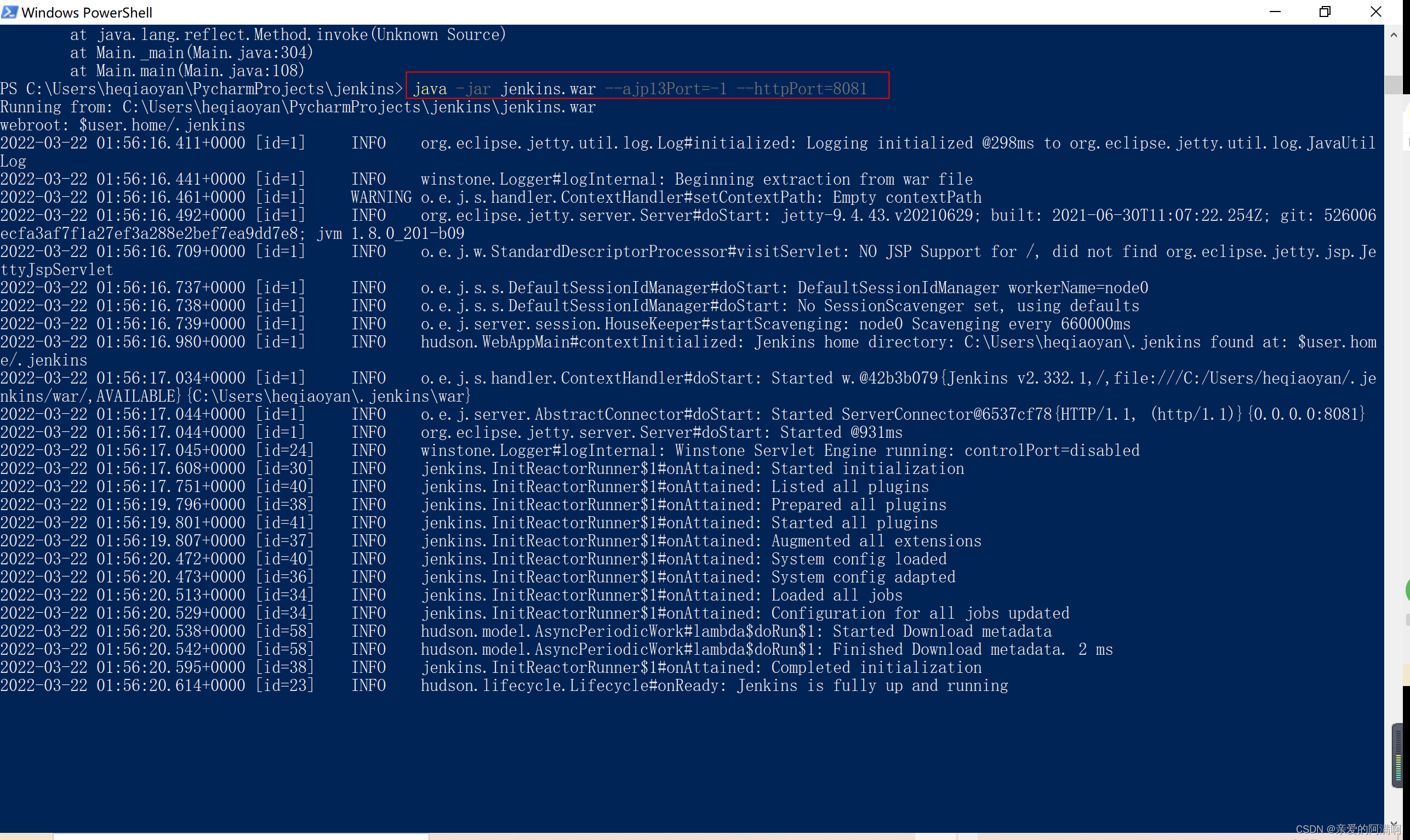 (2). 执行命令:“java -jar jenkins.war --ajp13Port=-1 --httpPort=8081”