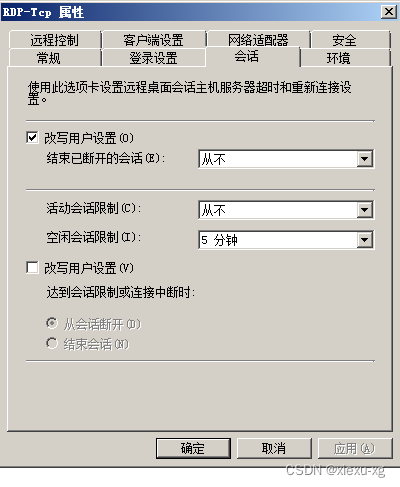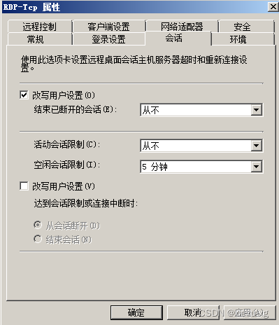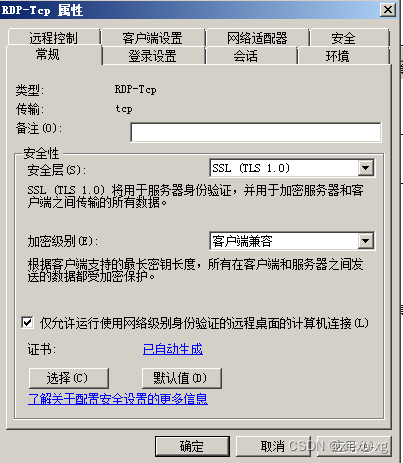 Windows:管理工具---远程桌面服务---远程桌面会话主机配置---RDP-Tcp右键属性;