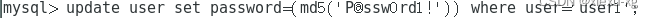 A5-4使用 mysql 内置 MD5 加密函数加密用户 user1 的密码为 (P@ssw0rd1!)。