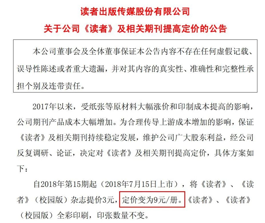 同年6月,读者出版集团董事长王永生又因涉嫌严重违纪违法被立案调查,一时间满城风雨;月底,读者传媒发布了涨价的公告,提价为9元/本,又惹出舆论纷纷。