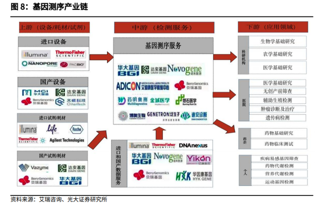 从整个基因测序服务的产业链看,华大基因处于行业的中游,其上游为基因测序仪和基因检测试剂,下游则是医院、科研机构、企事业单位或个体消费者。