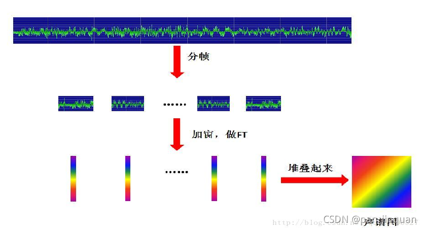 短时傅里叶变换(STFT),就是对短时的信号做傅里叶变换。原理如下:对一段长语音信号,分帧、加窗,再对每一帧做傅里叶变换,之后把每一帧的结果沿另一维度堆叠,得到一张图(类似于二维信号),这张图就是声谱图。