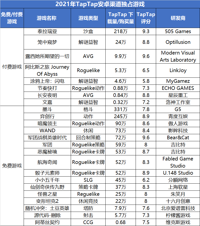 在2020年,TapTap曾拿下《帕斯卡契约》、《江南百景图》等游戏安卓独占权,但21年以来TapTap独占游戏并没有出现这类爆款。
