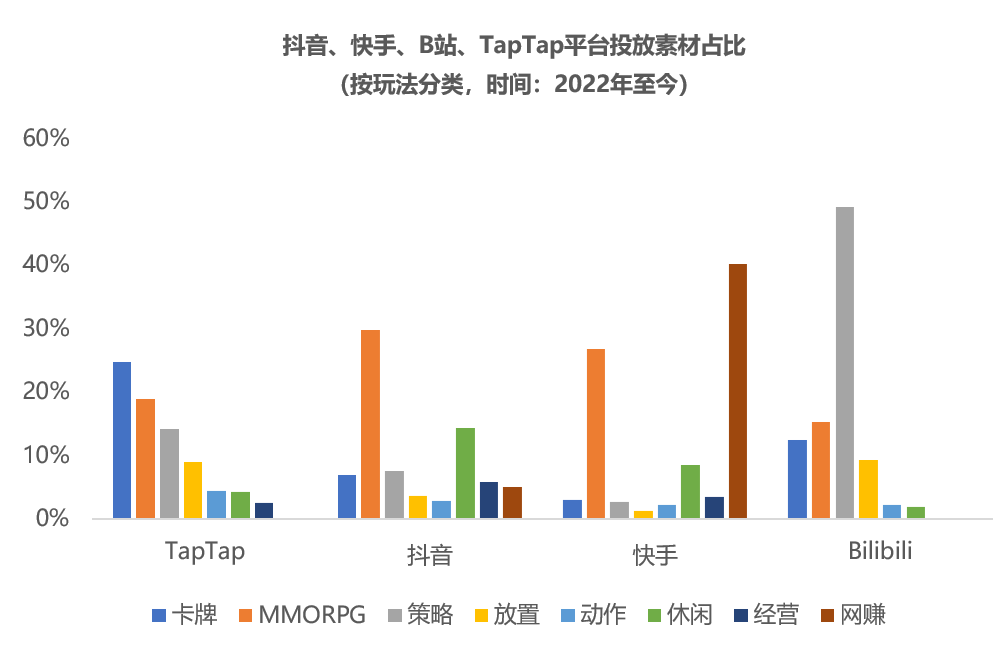 从投放素材总量来看,TapTap与抖音、快手两大短视频平台相差悬殊,与B站也存在不小差距。