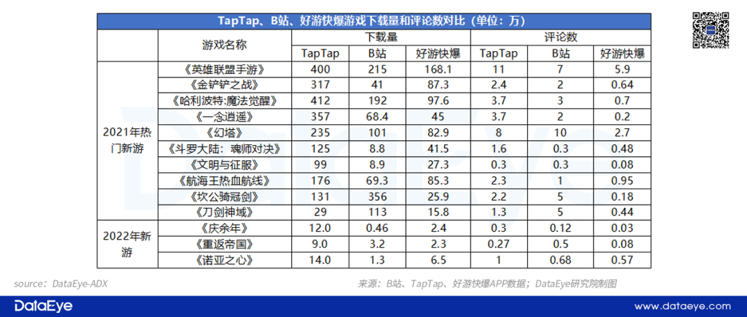 如果对比”下载量/评论数”,B站13款游戏平均每30次下载就会留下一条评论,TapTap和好游快爆这一指标分别为81和106,这说明B站游戏区社区氛围更好,用户粘性更强,而TapTap和好游快爆工具属性较强,用户“用完即走”。