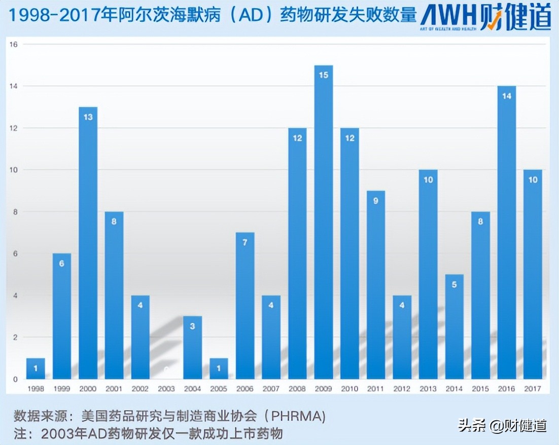 自发现阿尔茨海默症以来,已有超过300项相关临床试验宣告失败,国际各大知名药企几乎都试图攻克过阿尔茨海默症这一堡垒,诺华、强生、百健、礼来、辉瑞、罗氏、默沙东等都曾投身这一战场,不过胜率极低,可以说是医药研发失败率最高的领域之一。