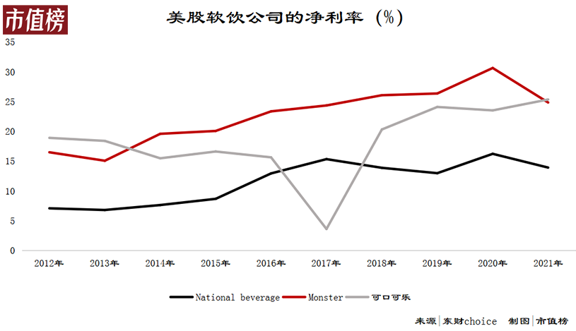 气泡水National beverage的净利率在近十年里最高为16.24%,Monster和可口可乐综合净利率较高,在20%——30%之间。