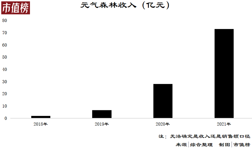 根据相关报道,2020年和2021年,元气森林的收入分别增长了3倍和1.6倍,2021年收入73亿元(一说,销售额,也有报道称70亿元)。