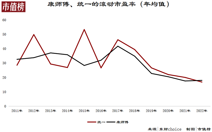 先看港股上市的两家,康师傅和统一,虽然都包含饮料之外的业务,但不妨做一个参考。