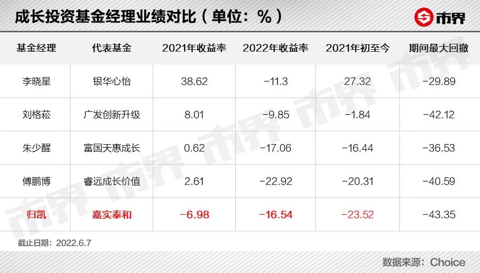同时,对比均衡成长投资的明星基金经理,归凯在2021年和2022年的整体表现、以及最大回撤表现一般。