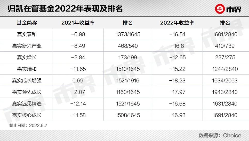 作为“嘉实一哥”的归凯,2016年3月开始管理的嘉实泰和年化回报12.81%,2022年初至今回撤21.64%。