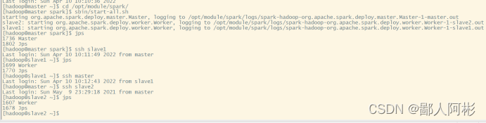 (7)分发文件,修改完成配置文件后,将spark目录分发至slave1和slave2节点,具体命令如下: