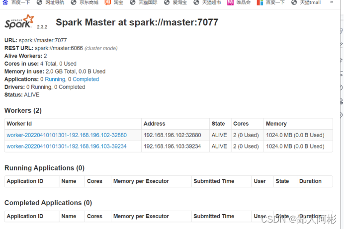 (9)从图中可以看出,当前主机master启动了Master进程,slave1和slave2启动了Worker进程,访问Spark管理页面查看集群状态(主节点),Spark集群管理界面如图所示;