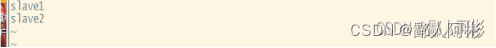 (6)通过“vi slaves”命令编辑slaves配置文件,主要指定Spark集群中的从节点IP,由于在hosts文件中已经配置了IP和主机名的映射关系,因此直接用主机名代替 IP即可。添加内容如下图: