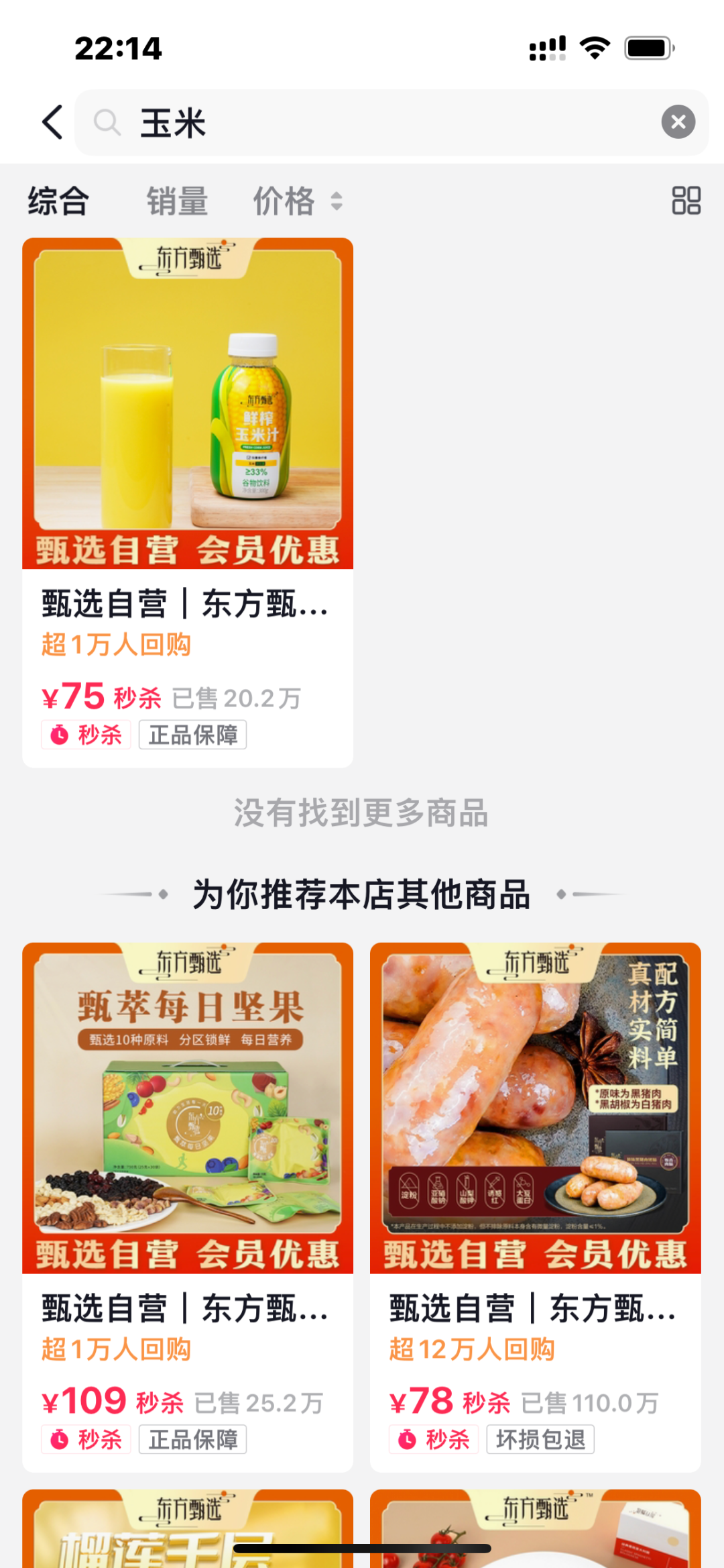 玉米价格争议爆发后,东方甄选的玉米显示“下架”状态,在东方臻选的抖音店铺搜索“玉米”,也只能搜到玉米汁。东方甄选对此回应,下架系供应商产能问题,有产品会再上架。