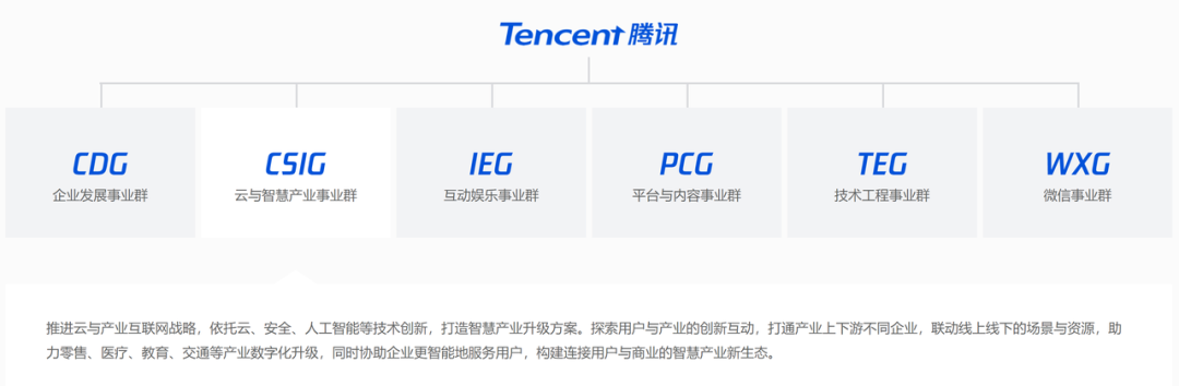 腾讯集团旗下有六大事业群,腾讯智慧出行隶属于云与智慧产业事业群(CSIG,Cloud and Smart Industries Group)。
