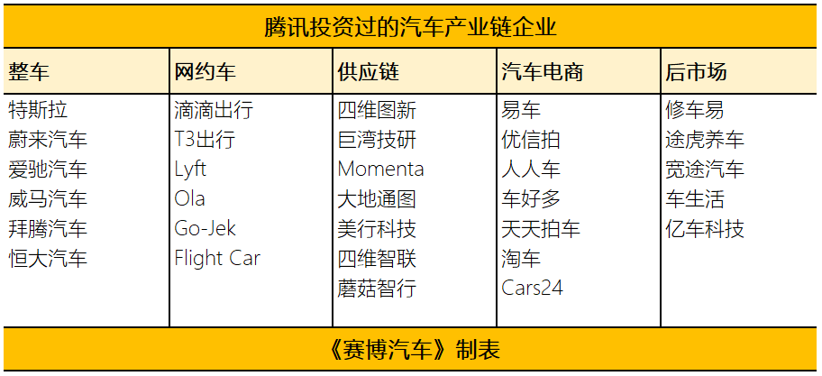 腾讯在汽车领域的投资也是遵循这一逻辑,投资的企业维度包括整车、网约车、供应链企业、汽车电商以及后市场等。