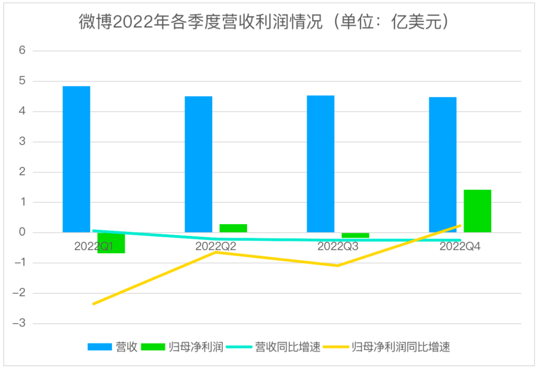 财报显示,微博2022年第四季度净收入为4.48亿美元,虽然略高于市场预期的4.46亿美元,但仍同比下降27.31%;归属股东净利润为1.42亿美元,同比增长22.62%,但在非美国通用会计准则下,净利润为1.78亿美元,同比下降8.7%。