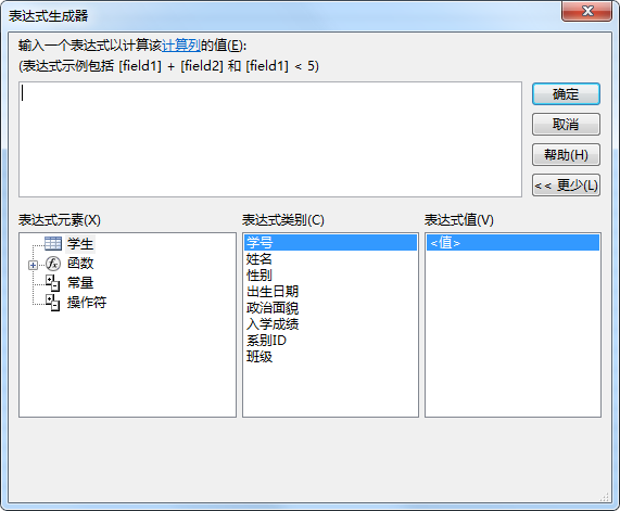 表达式生成器是Access提供的编写表达式的工具。使用Access进行数据库设计,在很多地方需要书写表达式。例如,在数据表中设置字段的有效性规则时,设置计算字段的数据表达式时,在查询中书写查询条件,进行计算时以及在窗体和报表的控件中设置计算表达式时。