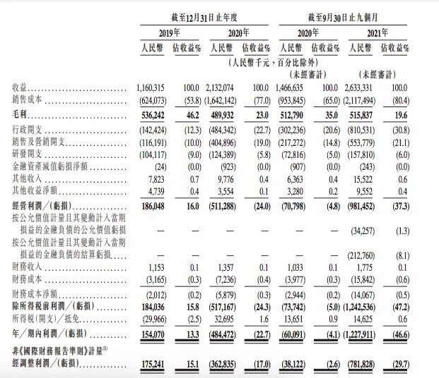 招股书显示,粉笔科技自2019年以来,营收连年增长,2022年上半年收入14.51亿元,毛利6.89亿元,毛利率达到了创纪录的47.5%。但同时,粉笔科技的净利润已连续亏损两年半,其2021年的亏损更是高达20亿元以上。