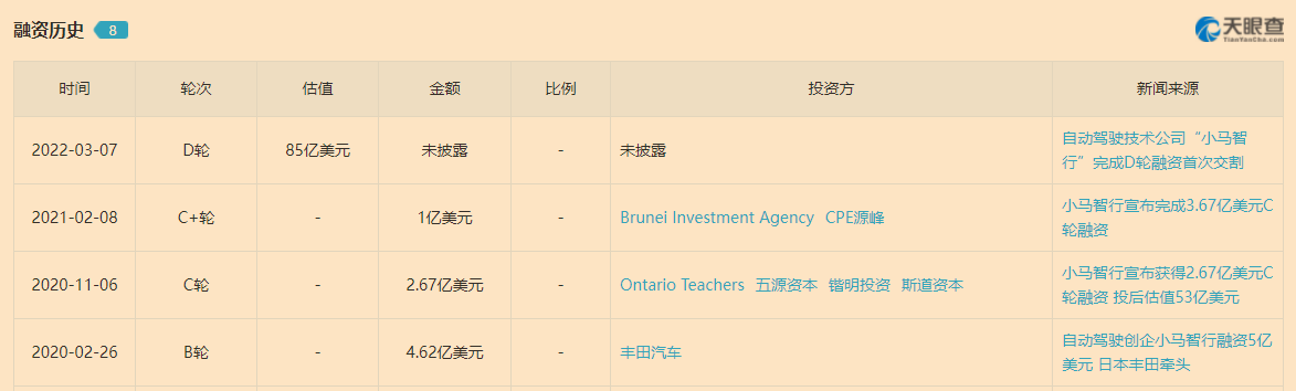 小马智行作为业内L4攀峰模式的明星独角兽,天眼查APP信息显示,D轮融资后其估值已经达到了85亿美元。