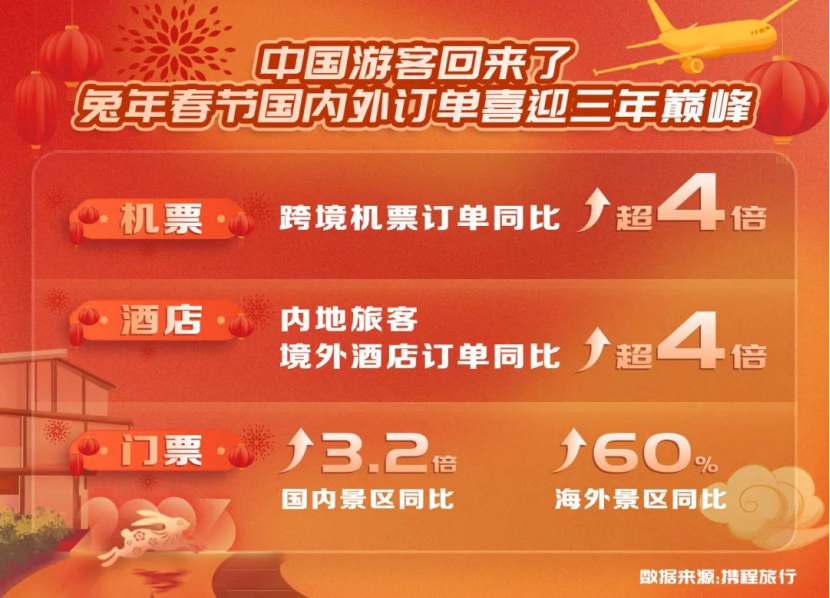 除此之外,内地旅客预订境外酒店订单量同比增长超4倍,跨境机票订单增长4倍,出境游订单同比增长640%,国内外旅行订单迎来久违的爆发性增长。