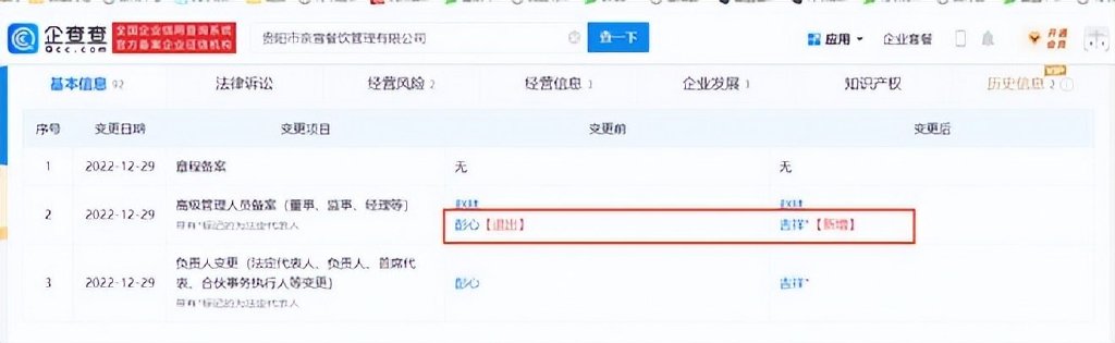12月29日,贵阳市奈雪餐饮管理有限公司的法人代表由彭心变更为吉祥;