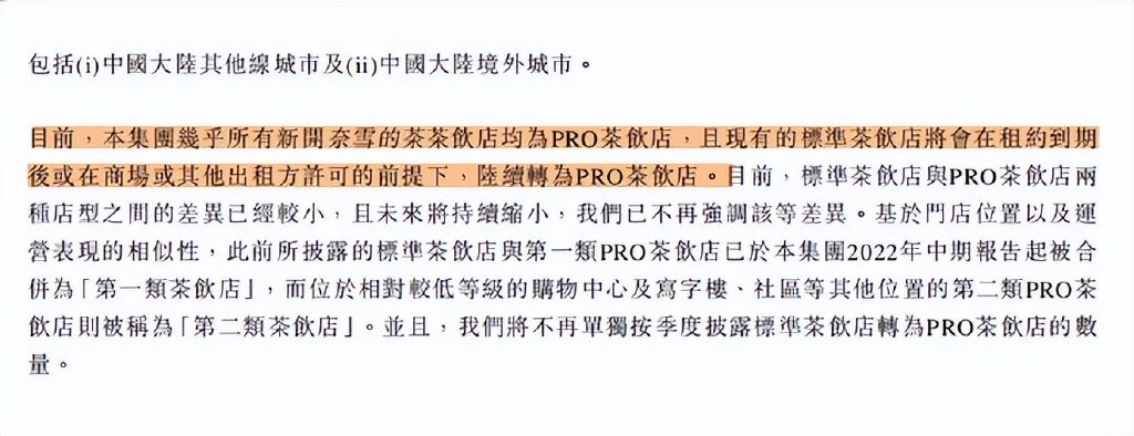 根据2022年第四季度运营情况显示,奈雪目前所披露的标准茶饮店与第一类PRO茶饮店已于本集团2022年中期报告起被合并为第一类茶饮店。