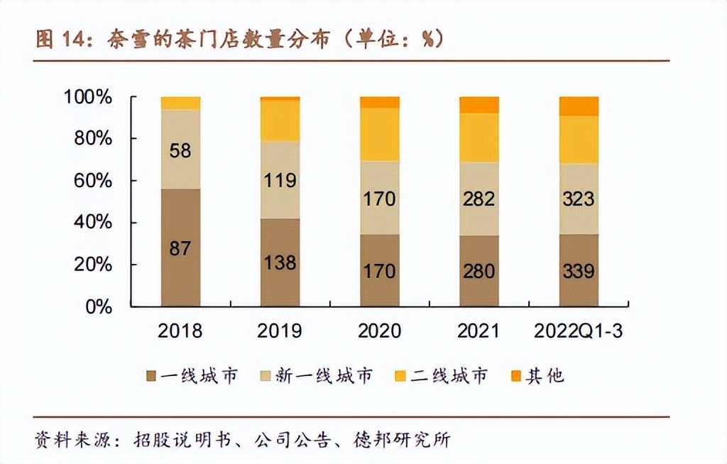伴随着品牌创立之初对标的星巴克“大店模式”被逐步放弃,奈雪门店面积变小的同时,门店选址也开始往一线以下的城市延伸。