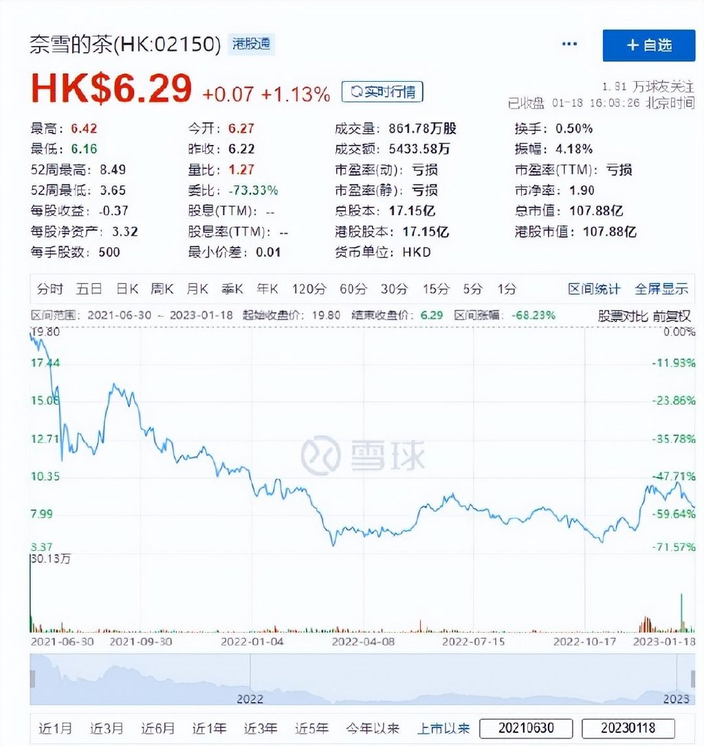 截至1月18日收盘,奈雪的茶最新股价为6.29港元每股,相较于19.8港元每股的发行价已经跌去68.2%。