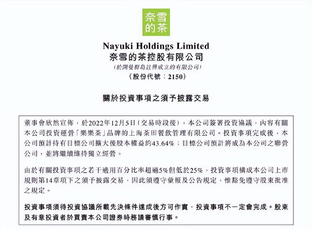 此前一直传言要被喜茶收购的乐乐茶,在2022年12月被奈雪的茶以5.25亿元收购。奈雪将持有乐乐茶43.64%的股份,但同时维持其独立运营,保持品牌和团队不变。