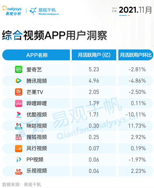 那些上半场积累沉淀下来的既有优势,如今成为束缚优酷创新的阻碍。易观千帆月活数据显示,截至2022年11月,综合视频类App排名中,爱奇艺排在榜首位置,月活人数5.5亿,腾讯视频以4.25亿月活排名第二,芒果TV和B站分列三四位,而优酷只有1.59亿月活,位列第五。