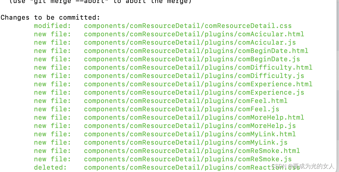 2.方案1:如果中途出现拉取代码突然中断或者闪退(没做完),在git status 出现很多绿色代码(不是自己的代码),可以进入之前的界面,在按“:q”回车就行了,意思就是退出编辑。