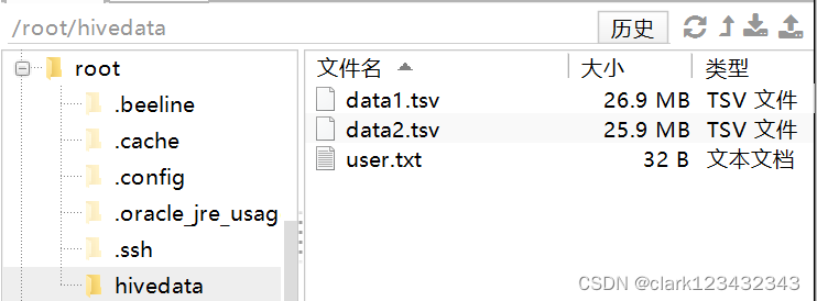 ③将两份数据data1.tsv和data2.tsv上传到HS2服务所在的本地文件系统(这里使用FinalShell,我的是在虚拟机node1的/root/hivedata/下)