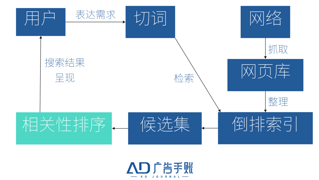 - 前台:消费者在搜索框中输入需求后,系统进行切词处理。比如搜索「北京美食」时,系统将这个问题分成「北京」和「美食」两个词。通过已倒排索引的网页库,系统筛选出同时与这两个关键词有关联的网页形成候选集,最后基于相关性计算排序结果优先呈现那些最有可能满足用户需求的网页。