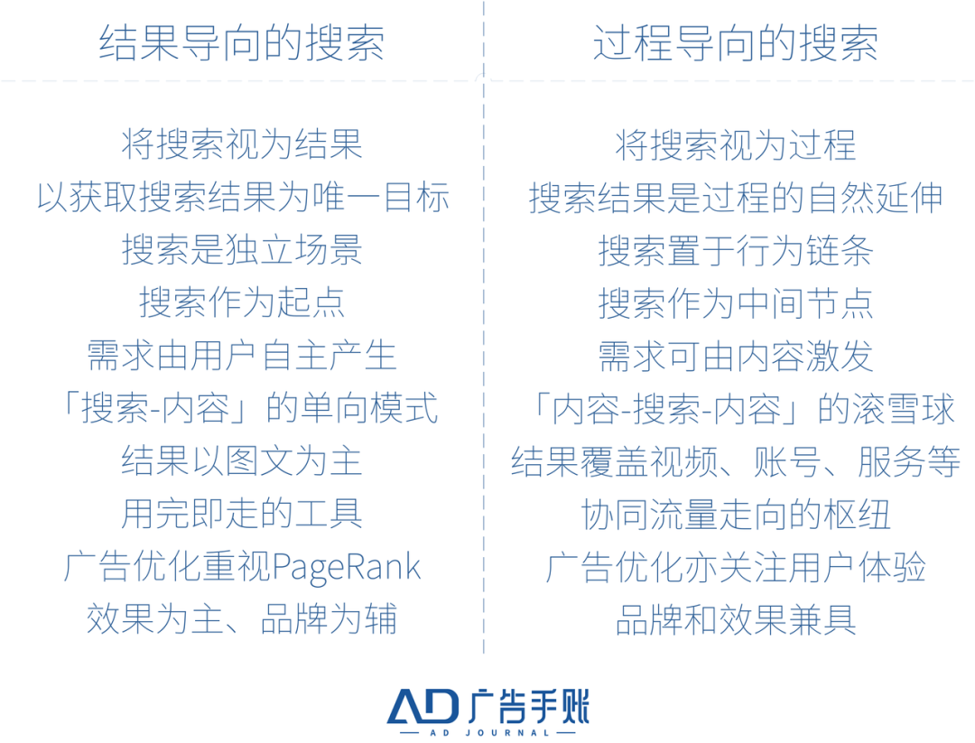 在此前的文章中,广告手账提到搜索应该分为「结果导向的传统搜索」和「过程导向的新搜索」两种。前者沿循的是「搜索-信息」模式,而后者呈现出「信息-搜索-信息」的滚雪球特点。谷歌、百度这样的搜索平台不仅面临应用内搜索的挑战,它们也会成为ChatGPT这类技术下的重灾区。
