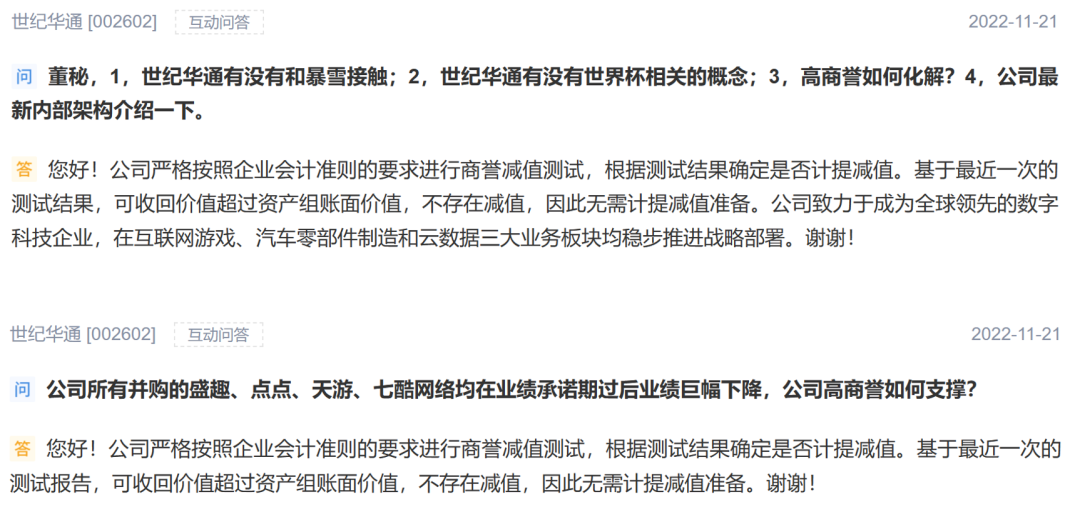 另一方面,在深交所互动易问答平台上,曾有网民多次向世纪华通问及商誉的问题,截至2022年11月,公司方面给出的回答均是:“基于最近一次的测试报告,可收回价值超过资产组账面价值,不存在减值,因此无需计提减值准备。”