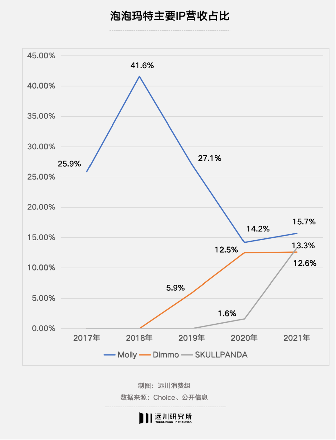 目前,Molly系列仍为泡泡玛特营收占比最大的IP,占比15.7%。在喊了几年“自己是一家IP培养公司”后,到了2021年,Dimoo和SKULLPANDA这两个IP眼看着也快要追平了Molly,分别创下了5.67亿元和5.95亿元的营收,占比12.6%和13.3%。