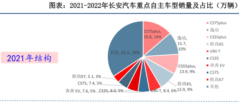 长安汽车以微车起家,而后进入乘用车市场。从2021年销售数据上看,长安汽车主销车型仍是以CS系列、逸动系列两大中低端燃油车型为主。