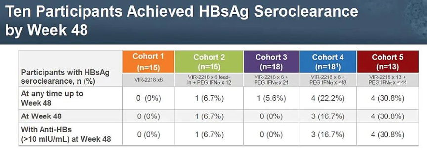 具体来说,腾盛博药此前公布的数据显示,BRII-835联合干扰素治疗慢性乙肝48周HBsAg清除率为30.8%。