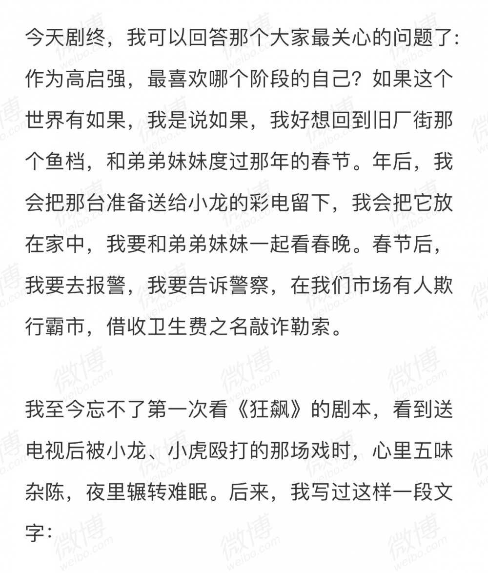 2月1日,《狂飙》正式收官,张颂文发文与高启强告别,他在微博里写道,“我至今忘不了第一次看《狂飙》的剧本,看到送电视后被小龙、小虎殴打的那场戏时,心里五味杂陈,夜里辗转难眠。”在这篇微博里,他还分享了自己“做为”高启强,关于要不要送电视去小龙、小虎的纠结和挣扎的心理活动。