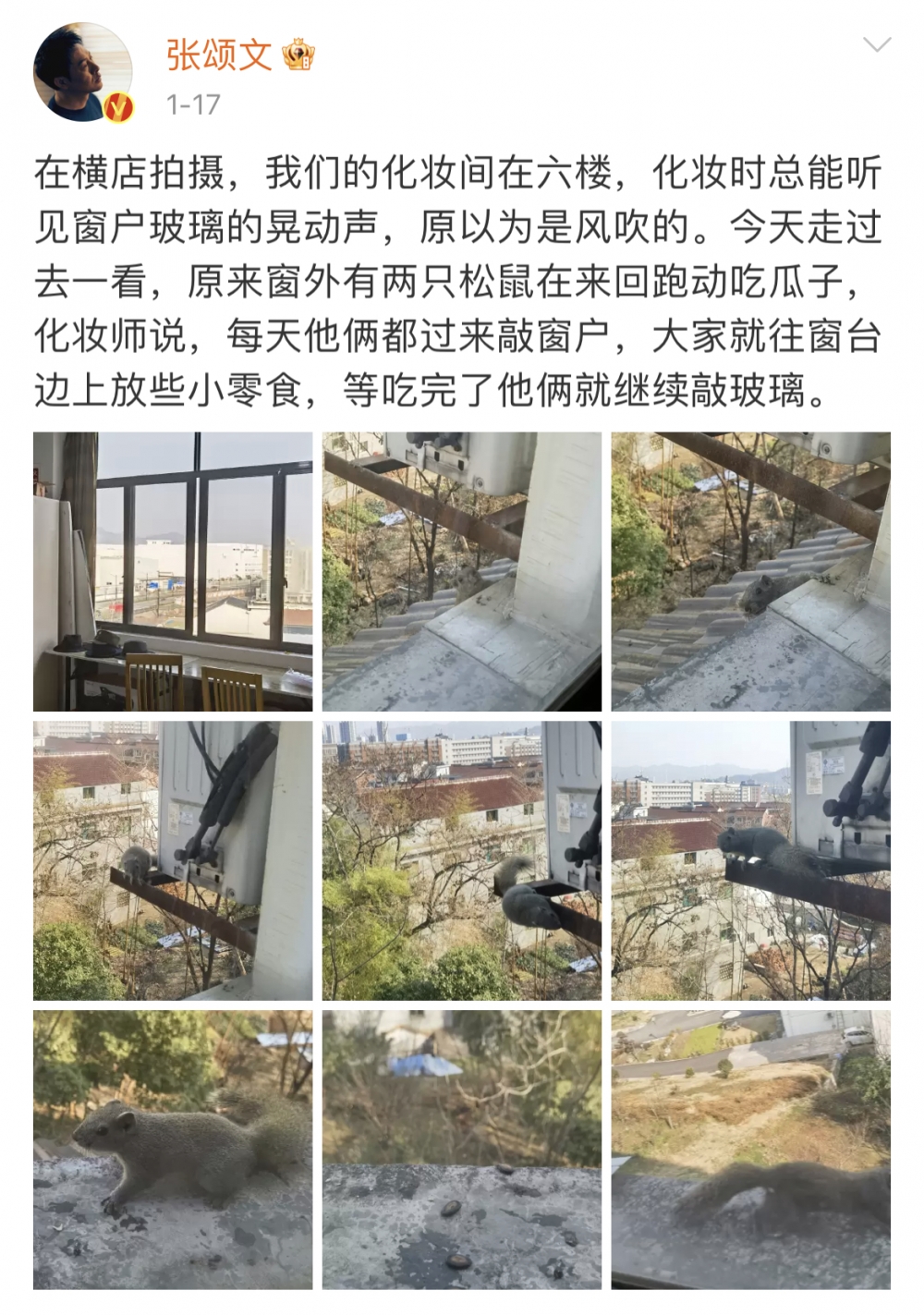 翻阅张颂文的微博,一个硬币、化妆间窗外吃瓜子的松鼠、拍摄场景里彩色的玻璃、房屋上的灯笼、种在门口的毛竹、街上理发店的门牌、海边的狐尾椰、三轮车的早点摊、流浪导家里的小猫咪……写满了对生活的热爱和细致观察的日常习惯。
