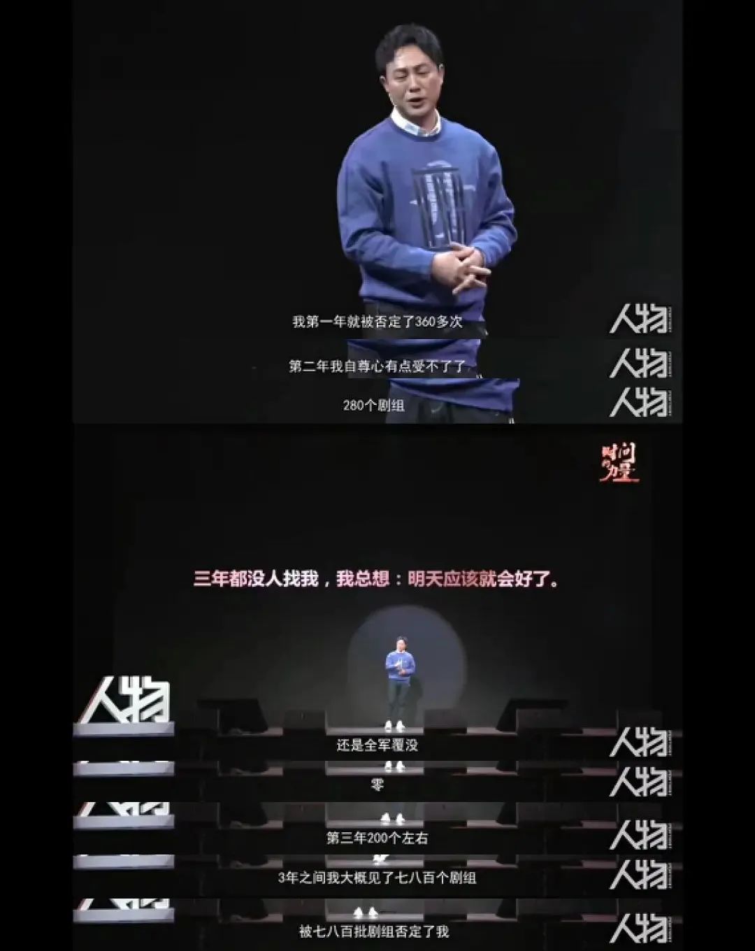 在人物的一段演讲里,他讲述了这一段三年见800多个组,被拒绝了800多次的经历。那是十年年收入不超过2万的艰难。在很长一段时间里,张颂文都没能实现拍电影的梦想,接了一些表演培训老师的活度日,在《幸福额度》《黄金大劫案》《大嘴巴子》等等影片里做表演指导。