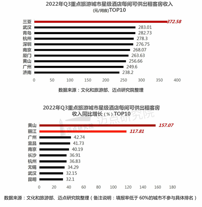 50个重点旅游城市星级酒店每间可供出租客房收入RevPAR情况,50个城市中高于全国RevPAR(155.67元/间夜)水平的共计30个,其中三亚、武汉、青岛、杭州、深圳、南京、厦门、黄山、广州和济南位列全国前十,三亚星级酒店RevPAR372.58元/间夜,在全国遥遥领先,是唯一高于300元/间夜的城市,约为全国平均水平的2.4倍。