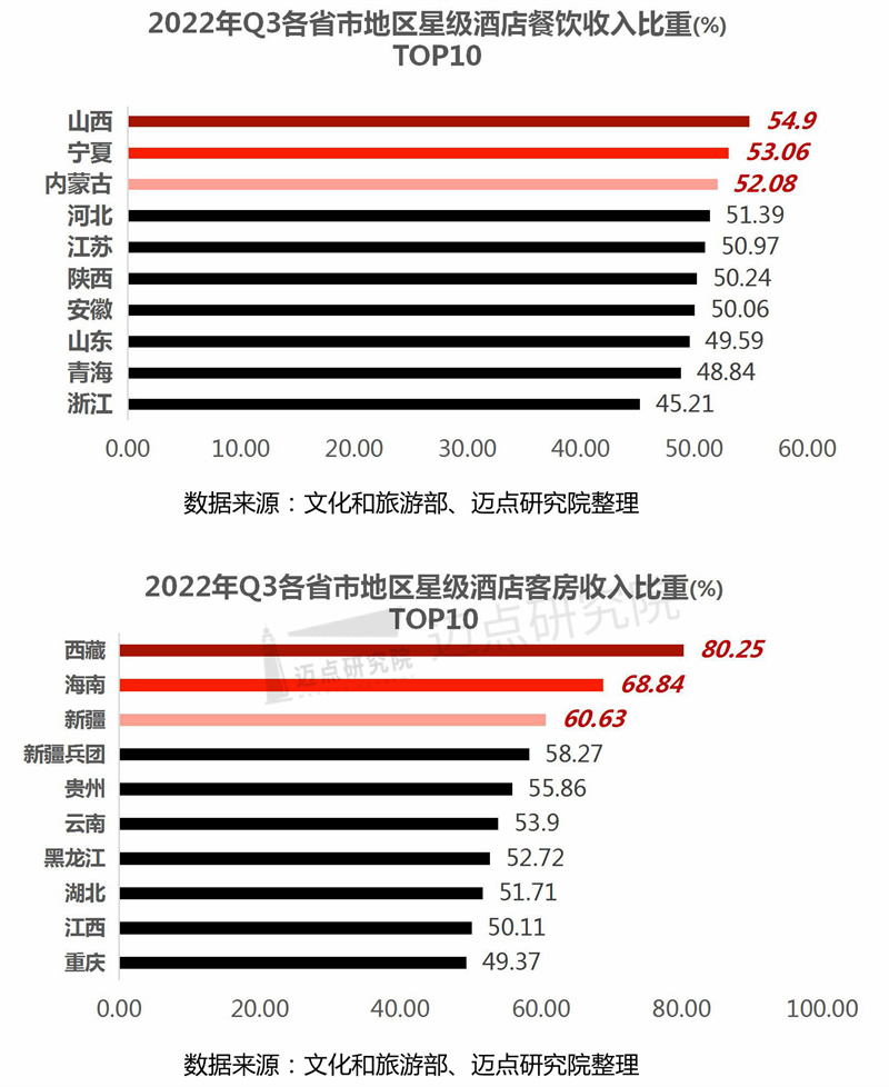 从各省市地区星级酒店营收结构看,11个地区餐饮收入占比高于其客房收入占比,且山西、宁夏、内蒙古、河北、江苏、陕西、安徽这7个地区餐饮收入占比超过50%;9个地区其客房收入占比超过50%,西藏、海南、新疆3个地区客房收入占比超过60%,其中西藏的客房收入占比为80.25%。