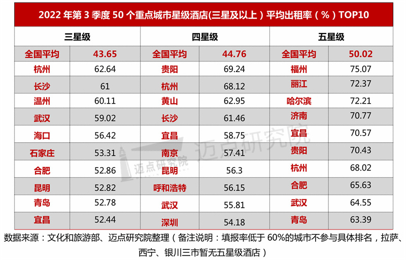 从不同星级看,50个重点旅游城市三星及以上星级酒店平均出租率情况,50个城市中三星级酒店平均出租率超过全国三星级平均水平(43.65%)的城市共计29个,位列前十的城市分别杭州、长沙、温州、武汉、海口、石家庄、合肥、昆明、青岛和宜昌,其中平均出租率超60%的城市为杭州、长沙和温州;50个城市中四星级酒店平均出租率超过全国四星级平均水平(44.76%)的城市共计25个,占一半。位列前十的城市分别为贵阳、杭州、黄山、长沙、宜昌、南京、昆明、呼和浩特、武汉和深圳,其中贵阳四星级酒店平均出租率69.24%,为全国最高,杭州为68.12%位列全国第二;47个城市中五星级酒店平均出租率高于全国五星级平均水平(50.02%)的共计28个,排名前十的城市依次为福州、丽江、哈尔滨、济南、宜昌、贵阳、杭州、合肥和青岛,其中平均出租率高于70%的城市有6个,福州市以75.07%位列五星级酒店平均出租率全国第一,其次是丽江为72.37%。