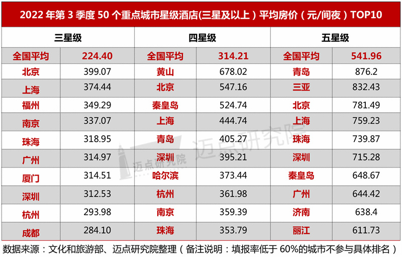 从不同星级看,50个重点旅游城市三星及以上星级酒店平均房价情况,50个城市中三星级酒店平均房价位列前十的城市分别为北京、上海、福州、南京、珠海、广州、厦门、深圳、杭州和拉萨;四星级酒店平均房价TOP10城市分别为黄山、北京、秦皇岛、上海、青岛、深圳、哈尔滨、杭州、南京和珠海;五星级酒店平均房价TOP10城市分别为青岛、三亚、北京、上海、珠海、深圳、秦皇岛、广州、济南和丽江。综上,北京、上海、珠海和深圳4个城市均位列三星级、四星级和五星级酒店平均房价TOP10。